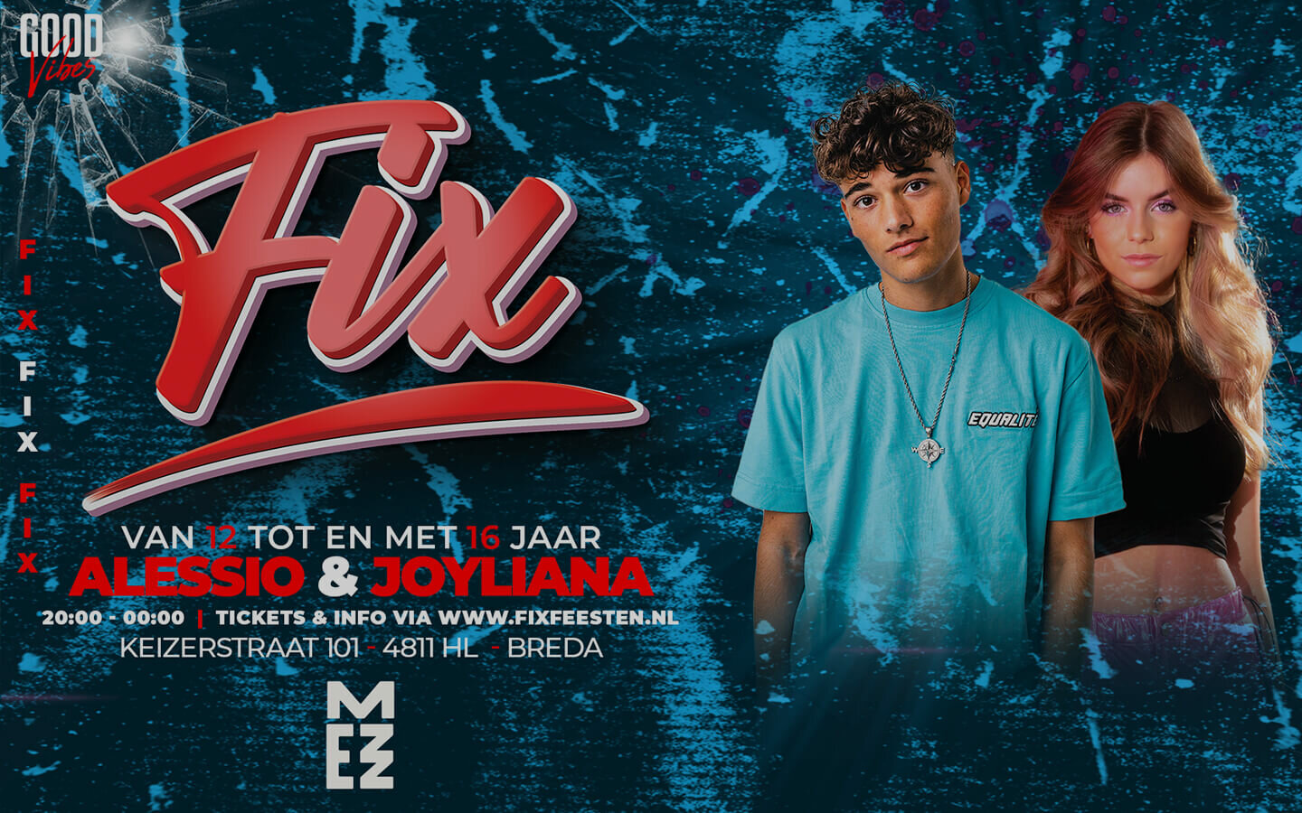 FIX 12+ is hét feest voor jongeren van 12 tot en met 16 jaar. Stilstaan is verboden en je wordt voortdurend vermaakt door artiesten die optreden. Niet alleen de headliners zijn belangrijk, de FIX residents zorgen ervoor dat het event van begin tot eind een onvergetelijke ervaring is. Op 1 september bij MEZZ met Alessio & Joyliana.