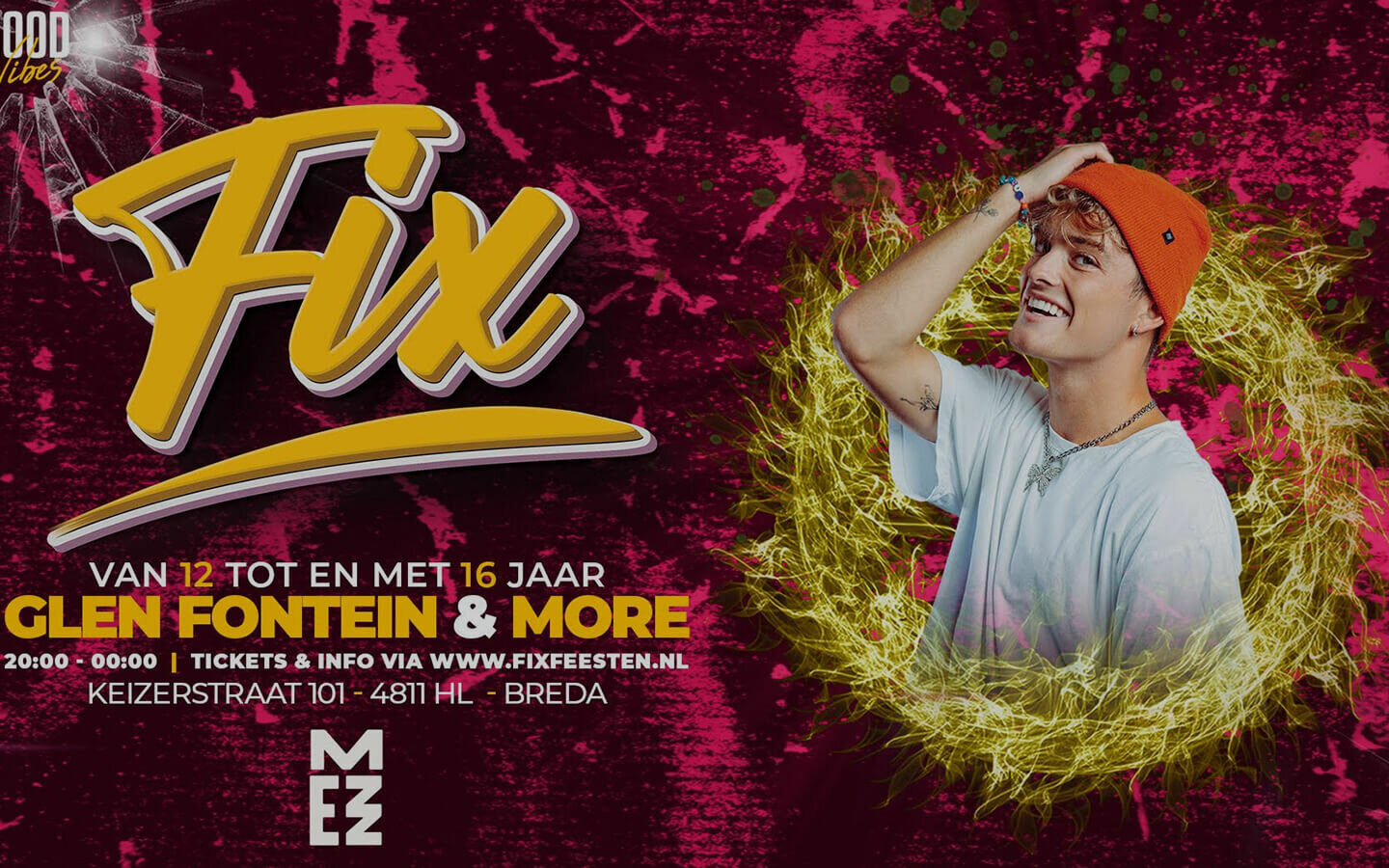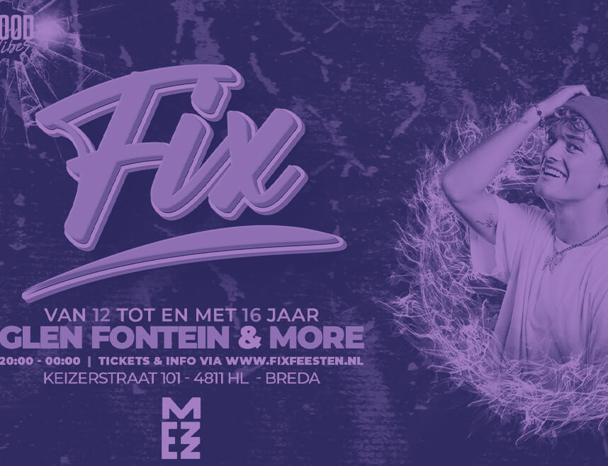 Fix 12+ is hét feest voor jongeren van 12 tot en met 16 jaar. Stilstaan is verboden en je wordt voortdurend vermaakt door artiesten die optreden. Niet alleen de headliners zijn belangrijk, de FIX residents zorgen ervoor dat het event van begin tot eind een onvergetelijke ervaring is. Op 23 december is FIX bij MEZZ met Glen Fontein.