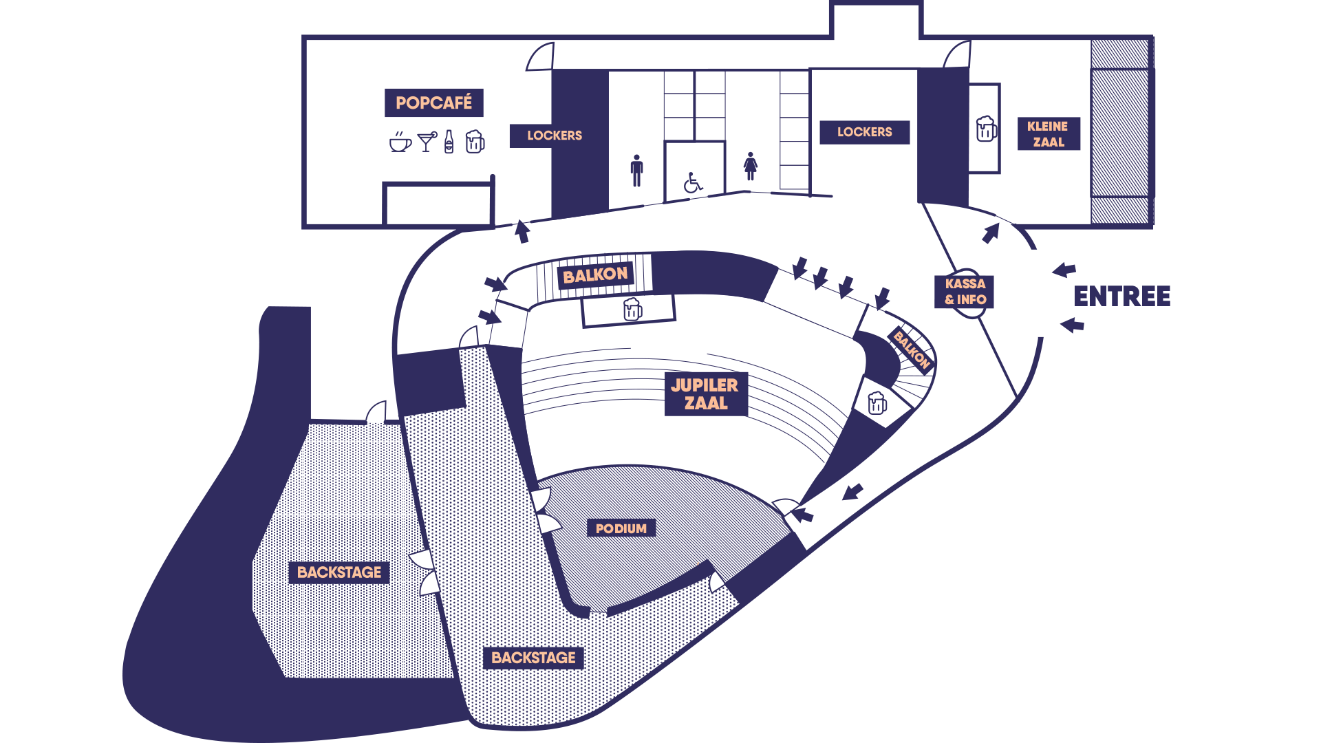 - De lockers voor bezoekers van de Jupiler Zaal bevinden zich in de foyer en bij het Popcafé. Betaal met je pinpas bij de terminal en je locker gaat open. De locker biedt plaats voor maximaal 2 jassen.